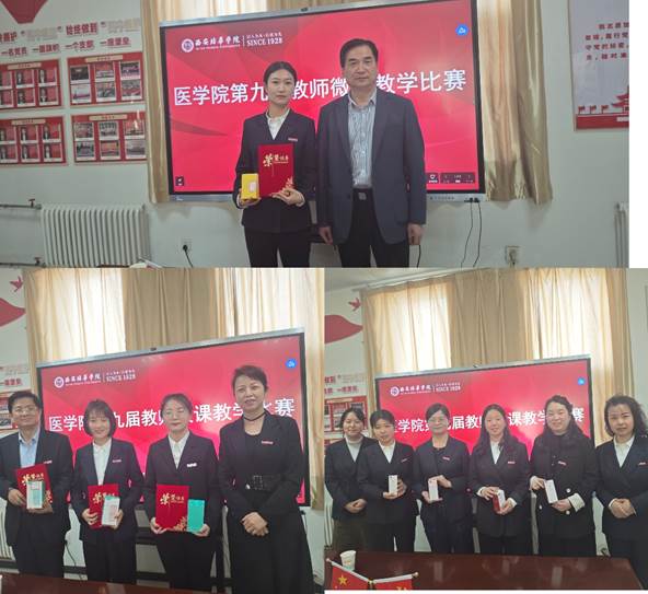 通过此次比赛,我院评出第九届微课教学比赛院赛获奖教师:一等奖1名:唐必欢;二等奖2名:卫钰、牛露露;三等奖4名:冯洁、胡盼、程薇薇、齐宗利;优秀奖6名:姜敏、吴梦迪、陈梦园、梁雪、王利平、蒙萌,并评出优秀组织者单位:护理系。邀请评委专家为获奖教师颁发礼品和获奖证书。