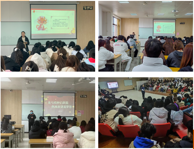 班会伊始,辅导员老师们对同学们致以新学期的祝福,并回顾了上学期的各项工作,对班级学生的成绩给予了充分的肯定。接着,各班辅导员从理想信念教育、收心教育与学风建设、安全教育与生命健康教育深入开展教育主题班会,培养学生厚植爱国主义情怀,教育引导学生树立正确的世界观、人生观、价值观,树立健康生活意识和安全意识,培养良好的学习和生活习惯,为新学期学校各项工作的开展奠定了良好基础。