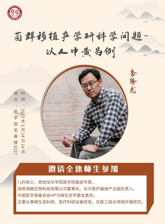 2023年3月14日,医学检验技术系邀请到西安培华学院医学院客座专家,湖南海路生物科技有限公司董事长李降龙教授为医学院师生进行题目为“菌群移植产学研科学问题-以人中黄为例”的专题讲座。