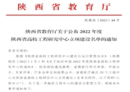 近日,陕西省教育厅公布了2022年度陕西省高校工程研究中心立项建设名单,我院基础系刘毅副教授领衔申报的“生物安全防御装备陕西省高校工程研究中心”项目,经过遴选推荐,形式审查、评前公示、专家评审、厅务会审议和结果公示,被确定为省教育厅55个工程中心的其中4一项。