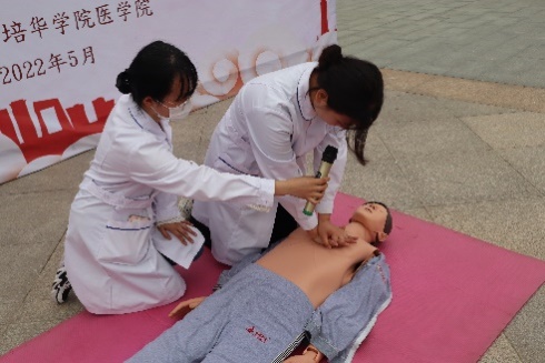 心肺复苏(CPR)是最基本的和最重要的抢救呼吸、心搏骤停者生命的医学方法,可以通过徒手、辅助设备及药物来实施,以维持人工循环、呼吸和纠正心律失常。由学生代表对现场的同学们进行急救教学,同学们近距离认真观察后,练习时得心应手。
