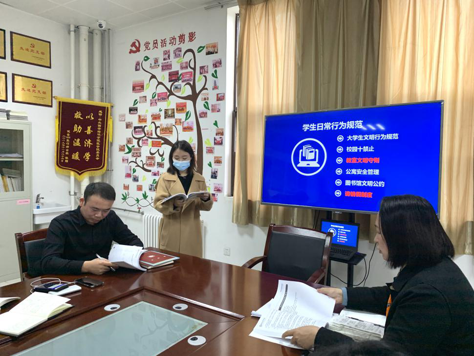 首先由学生干事刘斌老师与大家分享了他参加全省高校辅导员思想政治素养与业务能力提升专题培训班的心得与体会。刘老师就自己所参加培训的经历,与大家分享了学习的主要内容和参加学习的体会及感悟,他讲到新形势下辅导员的身份属性体现了网络与现实的虚实融合,作为高校学生工作者的一员,辅导员和学生接触最频繁、关系最密切,更应该答好教育系统疫情防控工作中“让祖国放心、让家长安心、让学生舒心”的答卷,密切关注、及时应对在疫情中的突发的各类危机事件。加强与学生的沟通交流,实时动态掌握学生状况。他指出在疫情期间,作为辅导员我们可以利用各种网络通信工具加强和学生的沟通交流,及时了解同学们的现实生活状况,一旦发现异常及时与这些同学进行交流,帮助他们解决思想上的困惑,克服心理障碍,纠正其错误的行为方式,才能最大程度地避免危机事件发生的可能性。其次,他讲到我们全体辅导员应强化应对危机事件的能力,保持沉着冷静的心态。疫情期间,当突发事件不可避免发生时,我们应当在第一时间和学生家长取得联系,了解事件产生的大致原因,初步分析事态严重性,稳定学生情绪,冷静处理事件并采取相应措施。