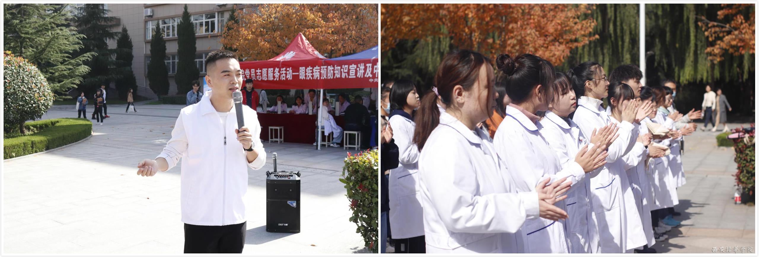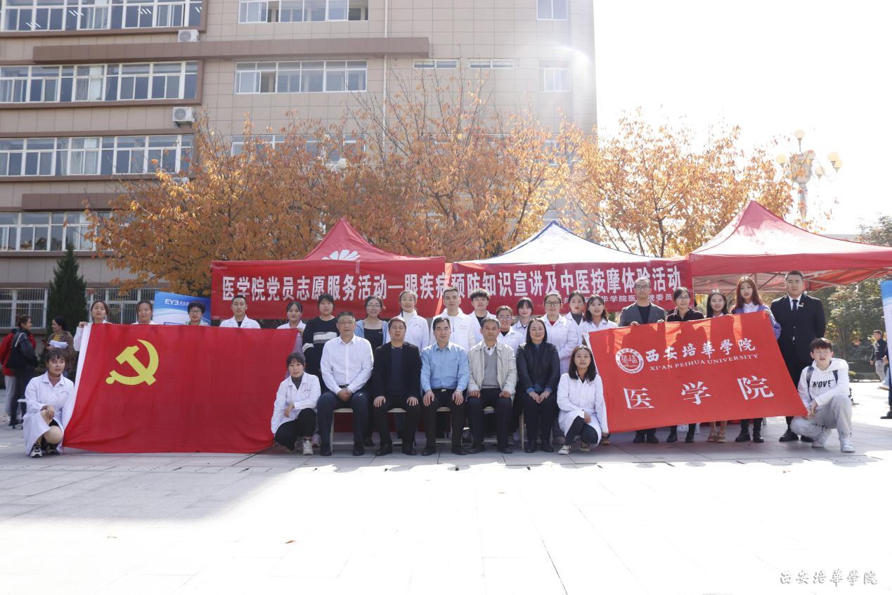 为庆祝传统佳节重阳节,大力弘扬中华民族尊老敬老的传统美德,10月22日下午,我院在综合楼西广场举办“党员志愿服务活动——眼疾病预防知识宣讲及中医按摩体验”活动。莅临本次活动的嘉宾是西安培华学院校医院院长李旭军、医学院常务副院长扈国栋、医学院党委书记兼行政副院长王平安、党委副书记何丽、医学检验技术专业刘利兵教授、护理系张竹映教授。