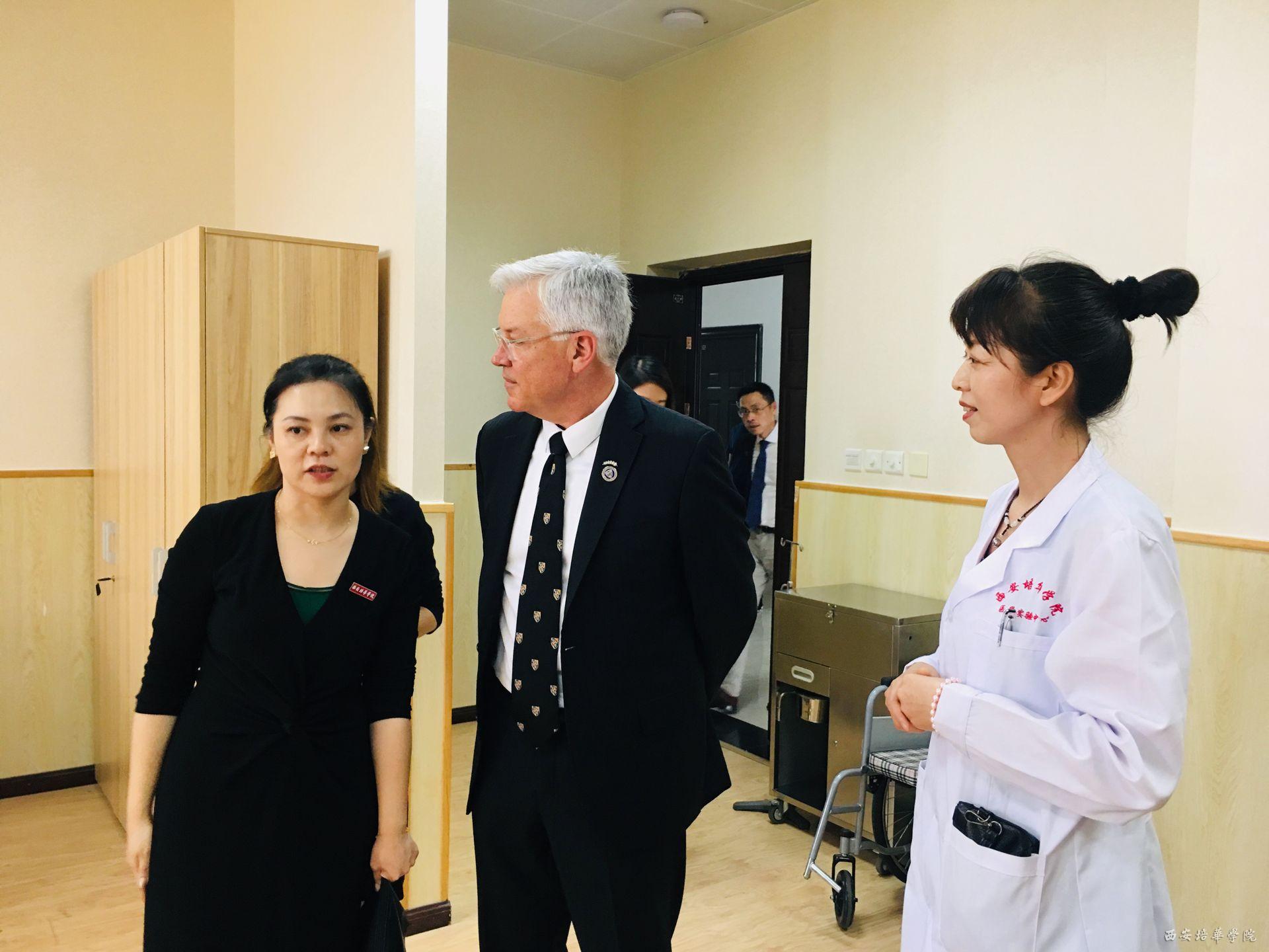 在理事长的带领下从西安培华学院所属区域历史,到学校发展史,都进行了全方位的讲解,带领美国约翰·霍普金斯大学护理学院副院长Kenneth Dion先生参观了医学院模拟医院、教学实验实训室、中心实验室等。