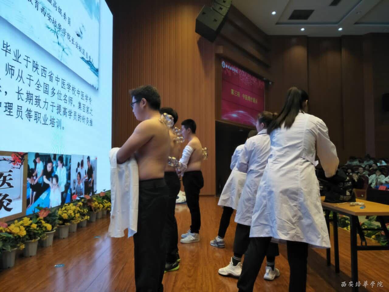 二、中医按摩护理老师原玮老师及学员为现场同学展示了中医的拔火罐和按摩技术。