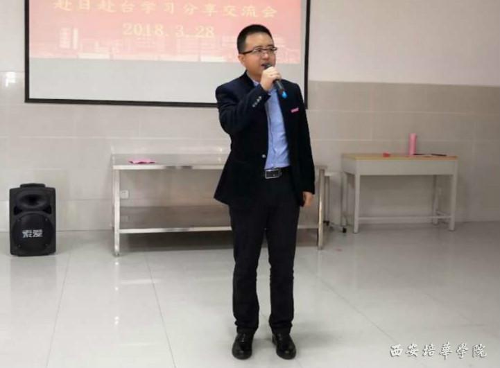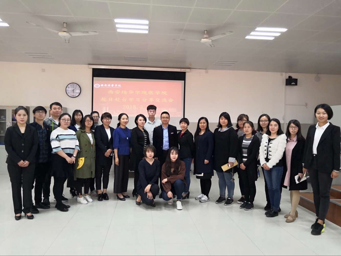 分享会伊始,我校医学院副院长姚斌向参会师生表示欢迎,并对王倩等三名同学赴台赴日期间的优秀表现提出表扬,指出他们不仅展示了西安培华学院学生良好的精神风貌,也为学校争得了荣誉。随后,姚院长介绍了医学院国际交流的开展情况。他表示要抓住“一带一路”和西安国际化大都市建设的发展机遇期,以中国文化和产业“走出去、引进来”为契机,加强与境外一流应用技术型大学开展多层次、高水平、实质性的合作。