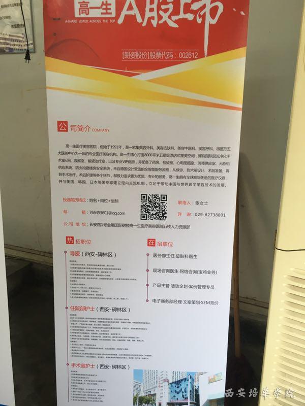随后,西安高一生医疗整形美容医院的负责人向在场同学放映了该医院的视频宣传片,展示了高一生医疗整形美容医院的发展历程,这是一家以医疗投资医院管理和临床医疗服务为主导产业的大型现代化集团企业,当前已经跻身于西北乃至全国最大的医疗企业之一,对西北地区以及中国医疗整形美容行业具有巨大的影响力,该医院始终坚持“以专业素质塑造企业文化,以企业文化培养优秀员工,以优秀员工创造一流品牌”的人才管理理念,努力为员工提供理想的事业平台,营造健康和谐的医疗美容环境。