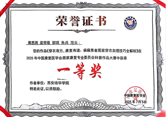 西安培华学院在此次全国大赛中的亮眼表现,不仅为学院赢得了荣誉,也为西北地区康复医学教育树立了标杆。据悉,获奖作品将在中国康复医学会官方平台进行展播推广,惠及更广泛的人群,照亮万千家庭的居家康复之路。