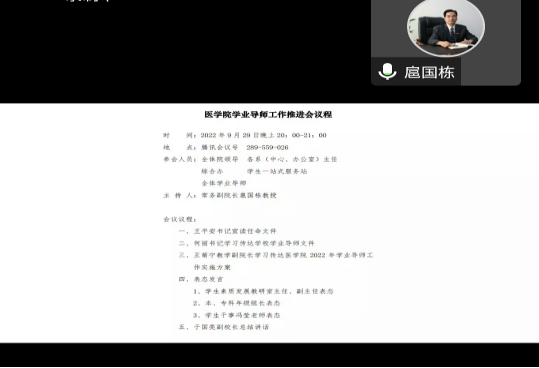 为进一步加强我院学业导师队伍建设和学风、教风建设,充分发挥教师在大学生成长成才过程中的重要作用,积极深入指导学生成长成才,深化全员育人、全程育人、全方位育人,以此提高学业导师创新工作机制;我院于9月29日在腾讯会议室召开全体学业导师工作推进会。于国亮副校长兼医学院院长、全体院领导及各系(专业)、中心领导、综合办、学生一站式服务站、全体学业导师参加了会议;我院学业导师总计97名,其中马克思主义学院6名。会议由常务副院长扈国栋教授主持。