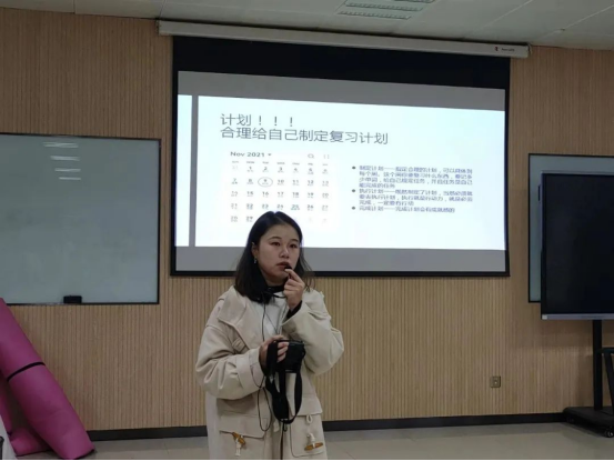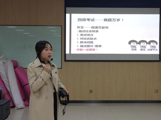 2019级李思敏同学介绍了四级英语考试的题型和分数占比等考试信息,并向同学们分享了在备考时间不足的情况下该如何提分的经验方法。与此同时,她还提出了“三省”激励大家:今天背单词了吗?今天做套题了吗?今天离考试还剩几天呢?吾日三省吾身,希望这样的自省能够帮助同学们提高自律性,在临近考试的日子里认真复习四级考试。