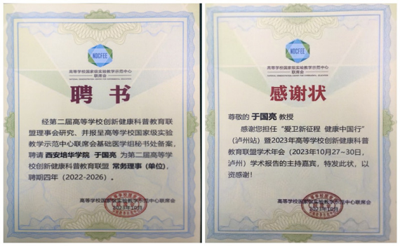 我校创新健康科普教育联盟常务理事单位聘书 副校长兼医学院院长于国亮主持嘉宾感谢状