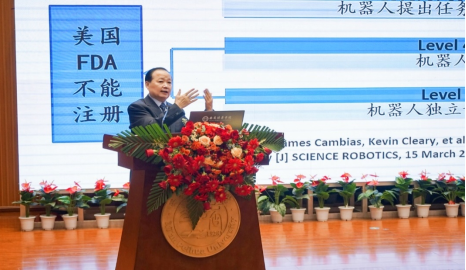 接下来,赵院士从1910年捷克斯洛伐克作家卡雷尔·恰佩克的科幻小说中创造出“机器人”开启了报告会。他分别从四大类医疗机器人:手术辅助机器人、康复护理机器人、诊断监护机器人和智能化自主手术机器人进行分享,他指出医疗机器人是一个多学科的交叉研究领域,研究内容广泛,其灵巧化、个性化、远程化、智能化、临场化的特点也必将在医疗领域取得更广泛的应用。