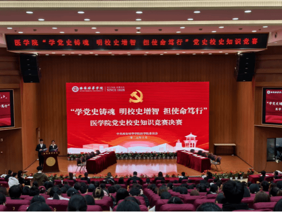在纪念中国人民抗日战争暨世界反法西斯战争胜利80周年的重要历史节点上,为弘扬党的优良传统、深化校史文化育人功能,进一步增强学生爱党、爱国、爱校的情感认同,10月22日,由医学院党委主办的“学党史铸魂、明校史增智、担使命笃行”党史校史知识竞赛决赛在维之图书馆报告厅顺利举行。医学院党委书记兼行政副院长史立军、党务兼行政干事刘慧、党务干事冯贝、各学生党支部书记以及全体党员、积极分子共同参与。本次活动由梁轩铭、牛毅华两位同学主持。