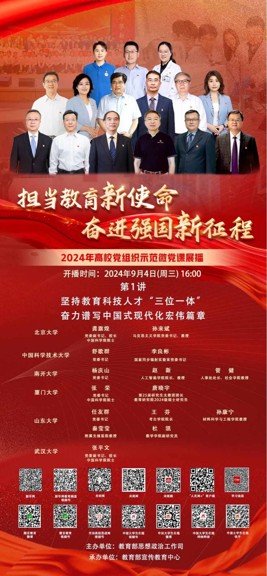 为迎接新中国成立75周年,激发和展示高校广大师生奋进强国新征程的强大力量,2024年9月4日,医学院党委组织全体师生党员学习收看2024年高校党组织示范微党课(第二阶段)第1讲《坚持教育科技人才“三位一体”,奋力谱写中国式现代化宏伟篇章》。首期微党课由北京大学、中国科学技术大学、南开大学、厦门大学、山东大学、武汉大学6所高校的主要领导、知名学者、教师及学生党员代表共同讲授,各高校结合政策阐释、优秀人物事迹、典型事例等,深刻阐述“教育、科技、人才是中国式现代化的基础性、战略性支撑”的丰富内涵,深入解读推进教育、科技、人才“三位一体”协同融合发展,微党课主题鲜明,制作精心,故事动人。