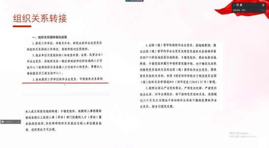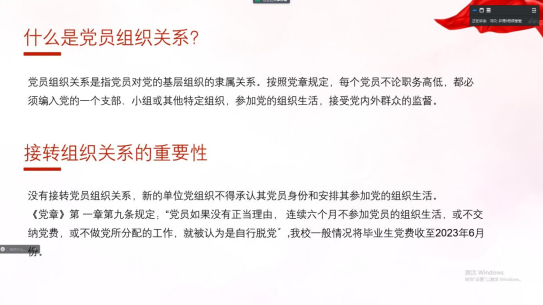 最后针对往届毕业生党员组织关系转接工作中的问题,冯贝老师对毕业生党员进行了组织关系转接的专题培训,详细地为大家讲解了什么是党员组织关系、组织关系的重要性以及省内、省外在组织关系转接过程中的各个环节注意事项,并多次强调各位毕业生党员要严肃认真地对待此项工作,通过讲解各位党员对于党员组织关系转接工作有了较为全面的认识。