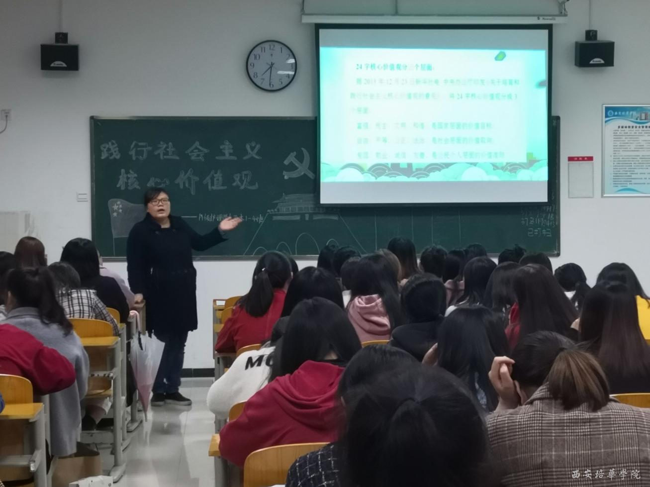 为了保证班会开的有质量,有效果,辅导员充分准备、精心组织。班会课上,各班级辅导员利用多媒体图片、视频、学生讨论、案例教育等形式向学生全面阐释了社会主义核心价值观的内涵:追求富强、民主、文明、和谐的国家理想;弘扬自由、平等、公正、法治的社会价值;遵守爱国、敬业、诚信、友善的道德规范。班会中同学们积极踊跃发言,表示要继续深入学习社会主义核心价值观,争做核心价值观正能量的传递者,用自己的实际行动践行社会主义核心价值观。