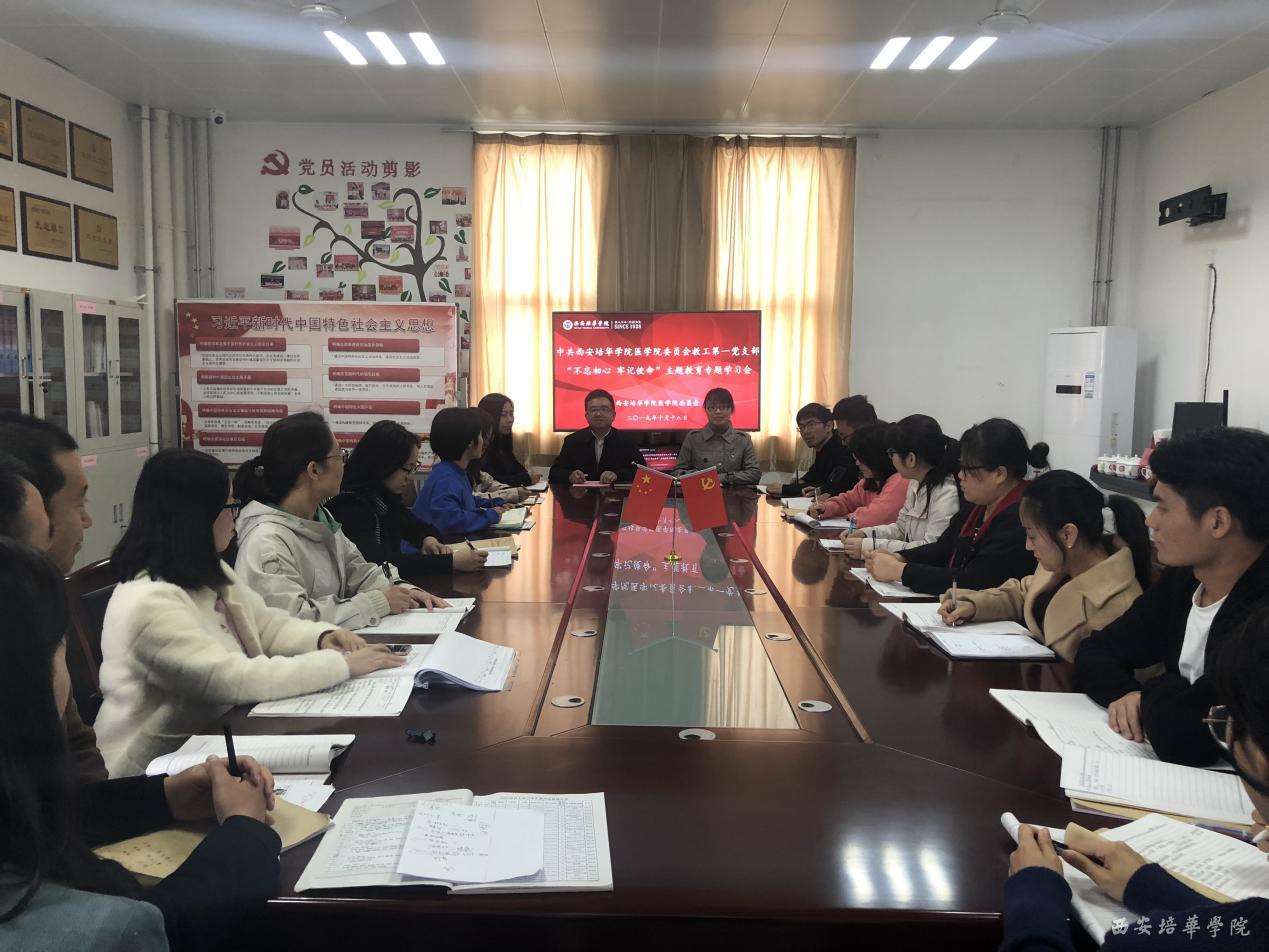 根据中省及学校关于“不忘初心 牢记使命”主题教育工作要求,结合当前本单位实际,为深入学习贯彻习近平新时代中国特色社会主义思想,扎实推进学院教育管理工作再上新台阶,2019年10月18日上午10:00,中共西安培华学院医学院教工第一支部委员会于至善楼8330党员活动室举行“不忘初心,牢记使命”主题教育第二期学习研讨会。本次会议由医学院教工第一党支部书记刘莎同志主持,支部全体党员参加学习。
