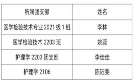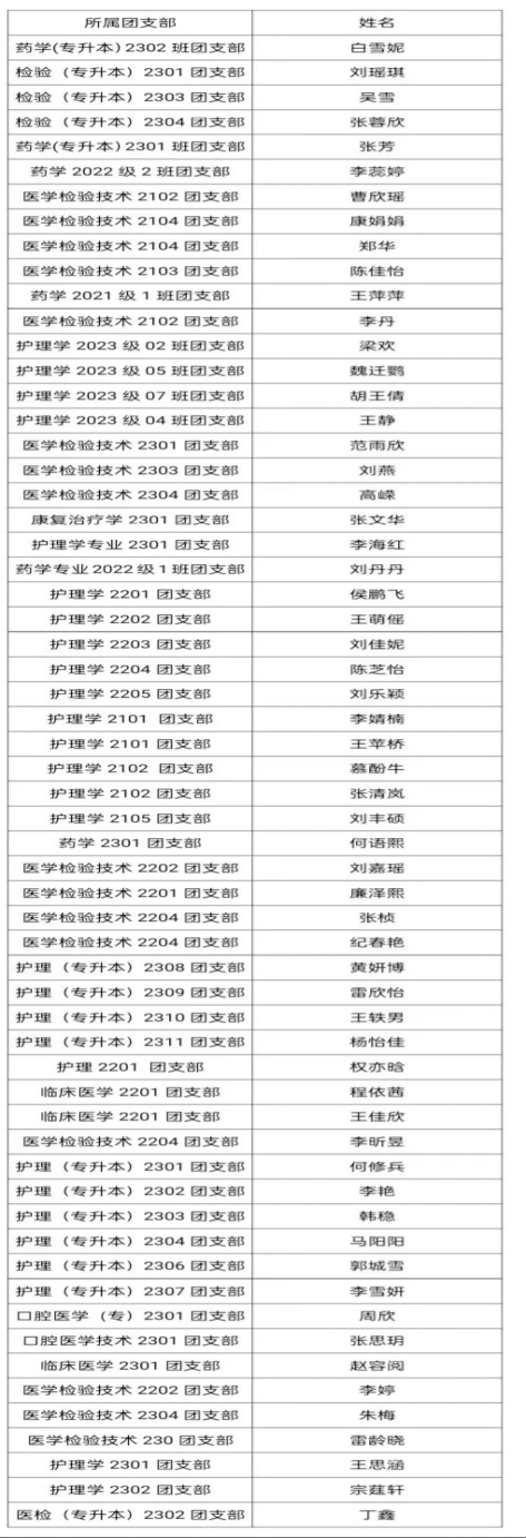 根据学校《关于评选2023-2024学年优秀共青团员 优秀共青团干部 新时代好青年 五四红旗团支部》文件精神,经学院各团支部和各组织申报,院团委审核,拟推荐以下团干及团员为2023—2024学年医学院“新时代好青年、优秀共青团干部、优秀共青团员、五四红旗团支部”。现将名单公示如下:
