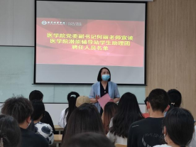 医学院党委副书记何丽老师也对心理委员工作的重要性做出进一步强调,她指出心理委员要善于发现身边同学的行为异常的情况。心理委员作为心理健康的传递者,肩负着关注班级同学心理健康状态、及时上报特殊情况、提供心理健康资源等重任。同时对就医学院潜能辅导站工作给予肯定,同时宣读医学院潜能辅导站学生助理团聘任人员及分配事项,并指出老师同学要配合完成好工作,希望医学院潜能辅导站能为学生的心理健康护航,学生助理团成员能够成为学院心理健康指导老师的得力助手。