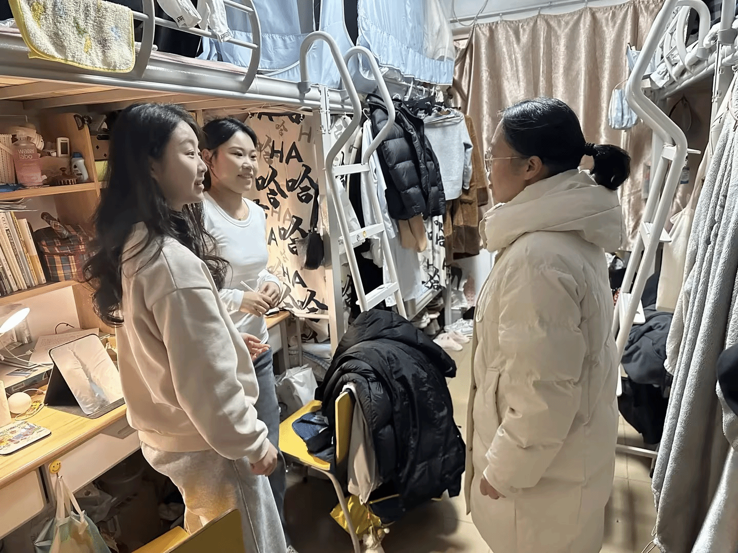 走访过程中,老师们细致检查每一间宿舍的用电安全,重申宿舍用电管理规定,严禁使用违规电器,反复叮嘱同学们做到“人走断电”。同时,结合近期高发的电信诈骗典型案例,老师们现场剖析诈骗手段,提醒学生树立理性消费观念,切实提升识诈防诈能力。耐心倾听返校适应情况,关注心理健康状态。针对春季心理波动规律,老师们特别倡导规律作息、适度锻炼,提醒同学间互相关心、互相支持,共同营造积极向上的生活氛围。