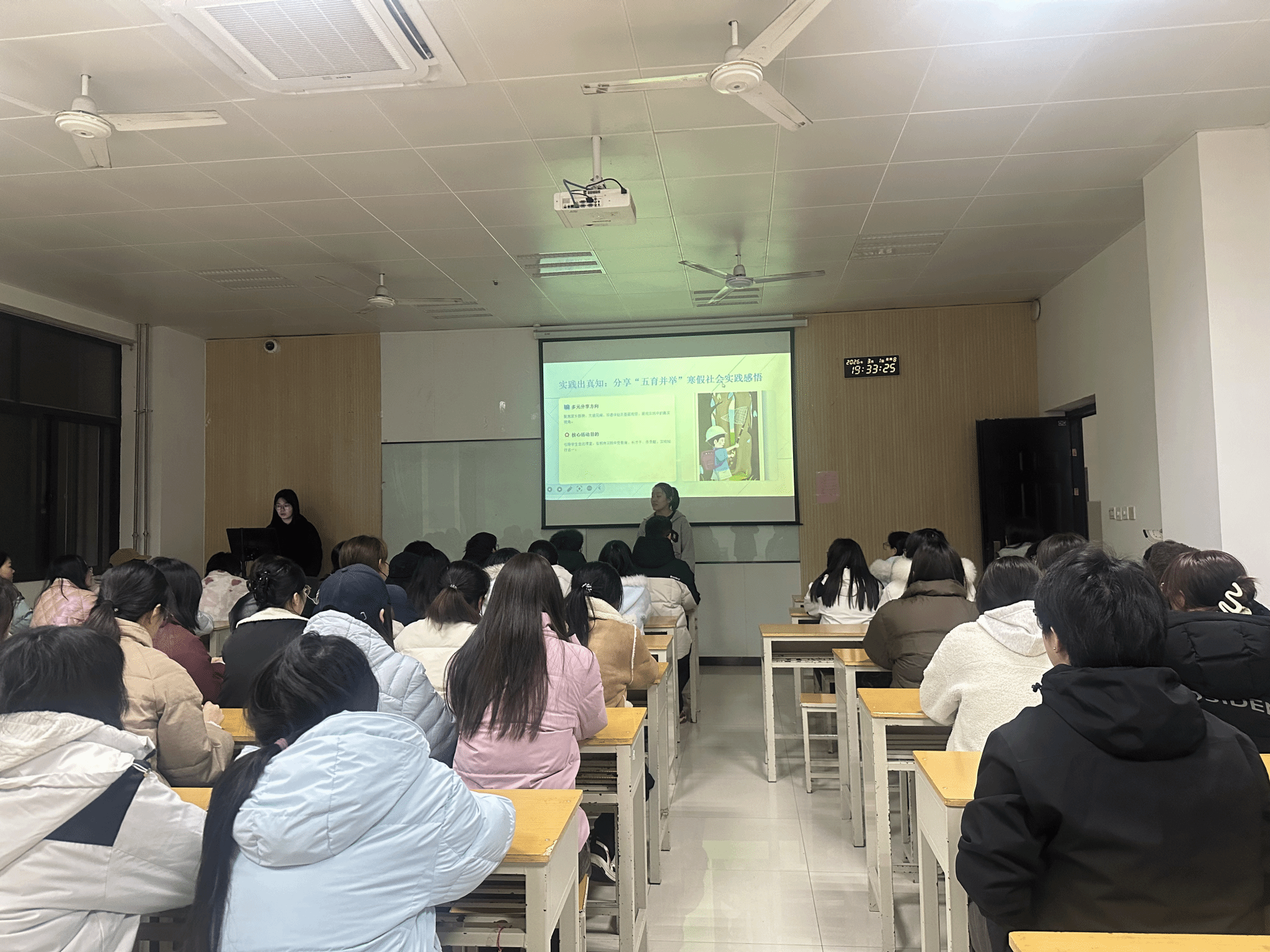 在理论学习环节,师生共同学习习近平总书记2026年新年贺词精神,深刻领悟“一起为梦想奋斗、为幸福打拼”的时代号召。生动讲述了曾正超、王伟肖等榜样人物的奋斗故事,引导学生在时代洪流中找准人生坐标,将个人理想融入强国建设、民族复兴的伟大征程。