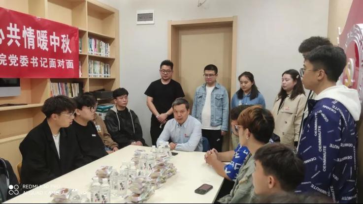 传媒学院党委书记、行政副院长江俊瑞带领学生社区21号楼全体驻楼老师,与新生代表欢聚党团活动室,开展“党建引领聚合力 同心共情暖中秋”书记面对面座谈会,了解同学们生活、学习中的困难,为其排忧解难。会后同学们纷纷在手绘海报上写下自己的中秋祝福,表达了对老师、家人的感谢。