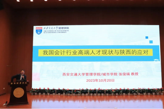 西安交通大学管理学院教授、博士生导师张俊瑞作《我国会计行业高端人才现状与陕西的应对》讲座。张教授从会计人才对于国家经济的重要性讲起,将会计学科、会计行业、会计发展进行了系统梳理,他分享了我国会计行业高端人才的发展现状,并对同学们的未来职业规划提出建议,获得与会师生热烈掌声。
