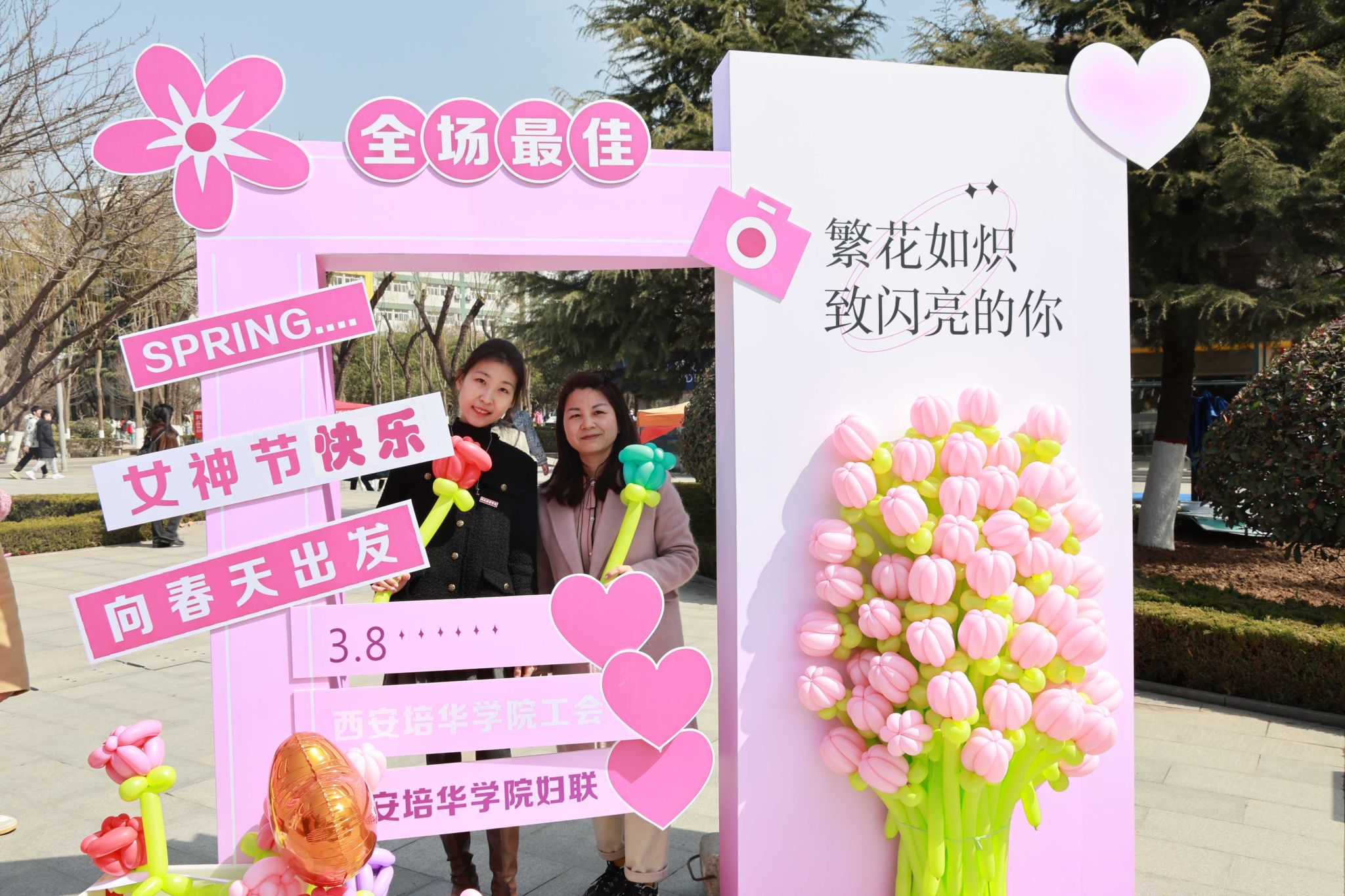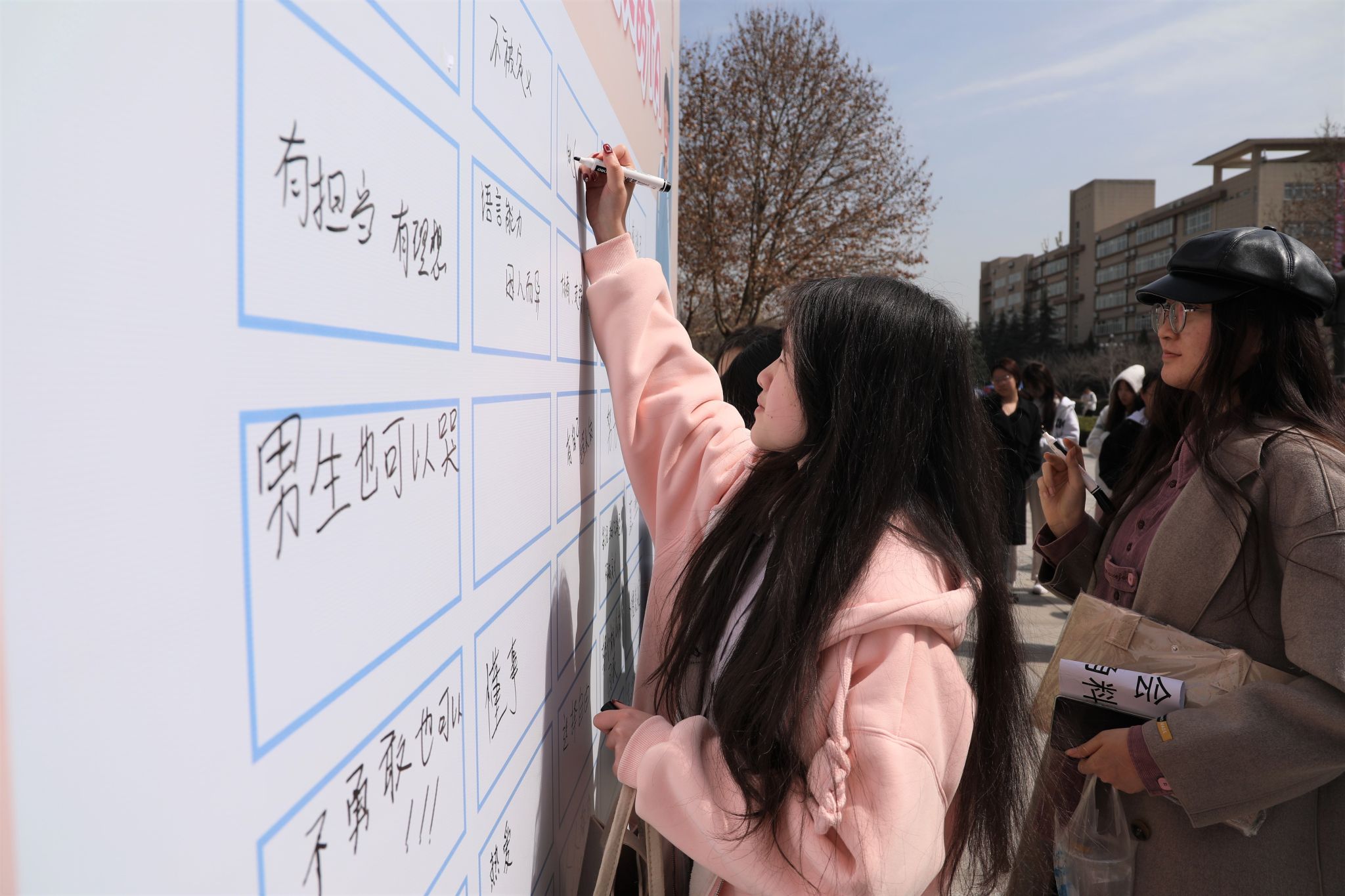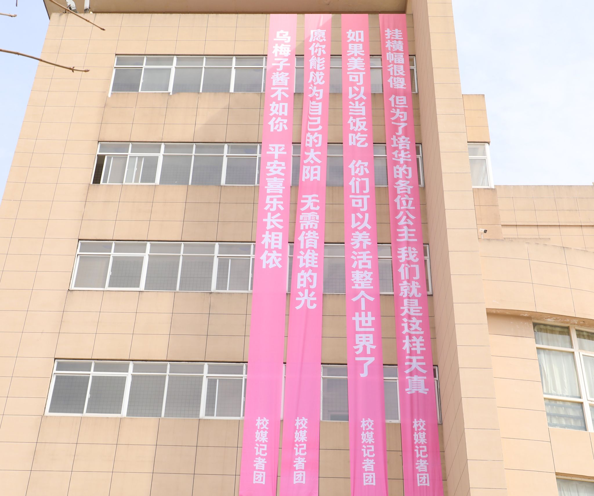 除了丰富多彩的活动,校媒记者团的同学们还为大家带来节日的惊喜——用粉色的条幅送上了一面墙的祝福。