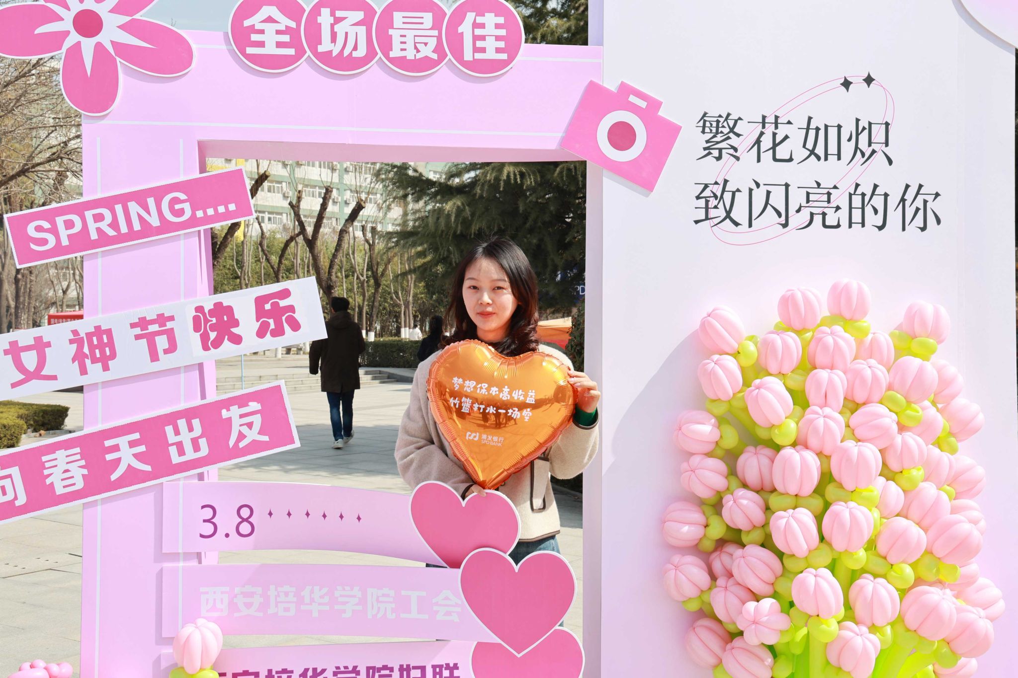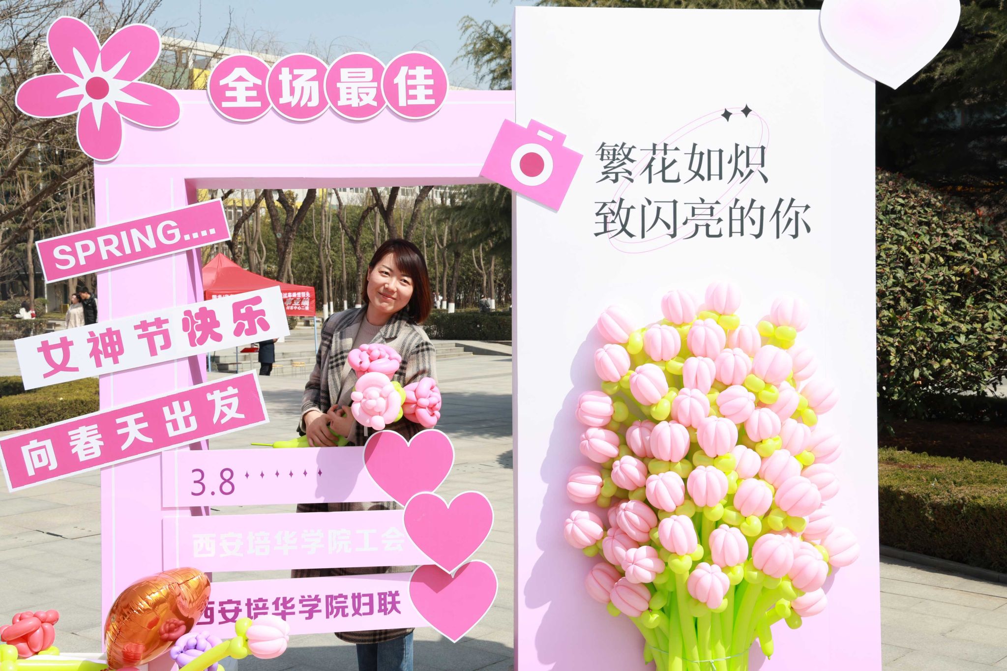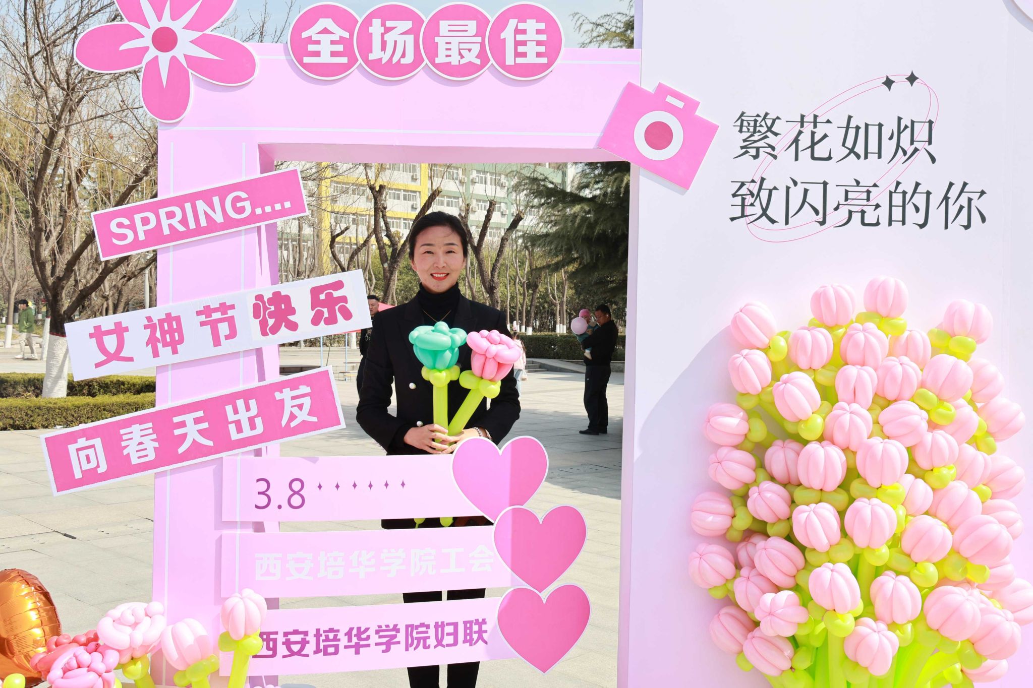 除了丰富多彩的活动,校媒记者团的同学们还为大家带来节日的惊喜——用粉色的条幅送上了一面墙的祝福。