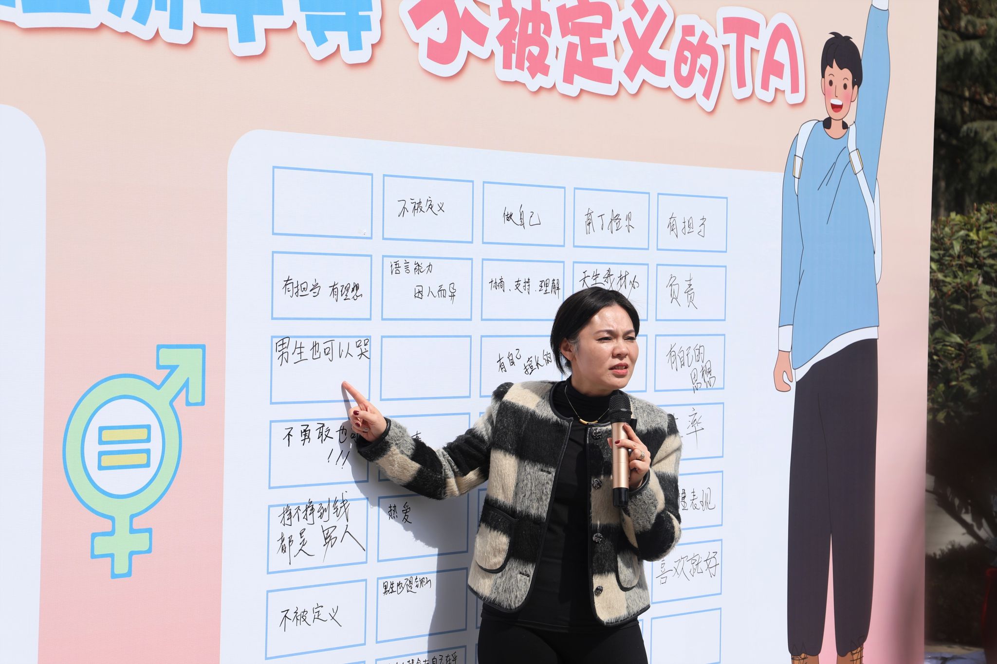 下午,女子学院在维之图书馆广场举办了“性别平等 不被定义的TA”女大学生文化节主题活动。现场同学们撕掉性别刻板印象的纸条,重新赋予性别平等或者性别公正的含义。用知行合一的举动,去推动实现男女平等的行动!