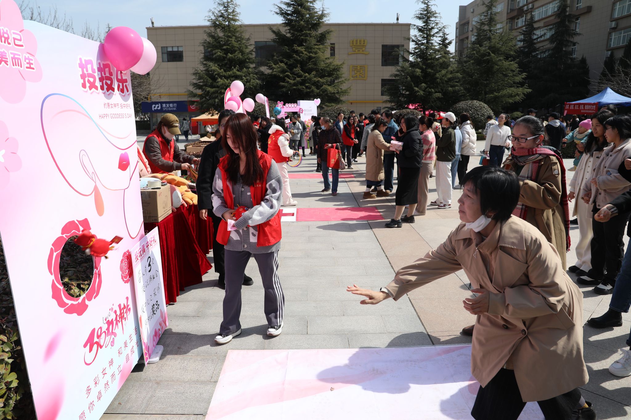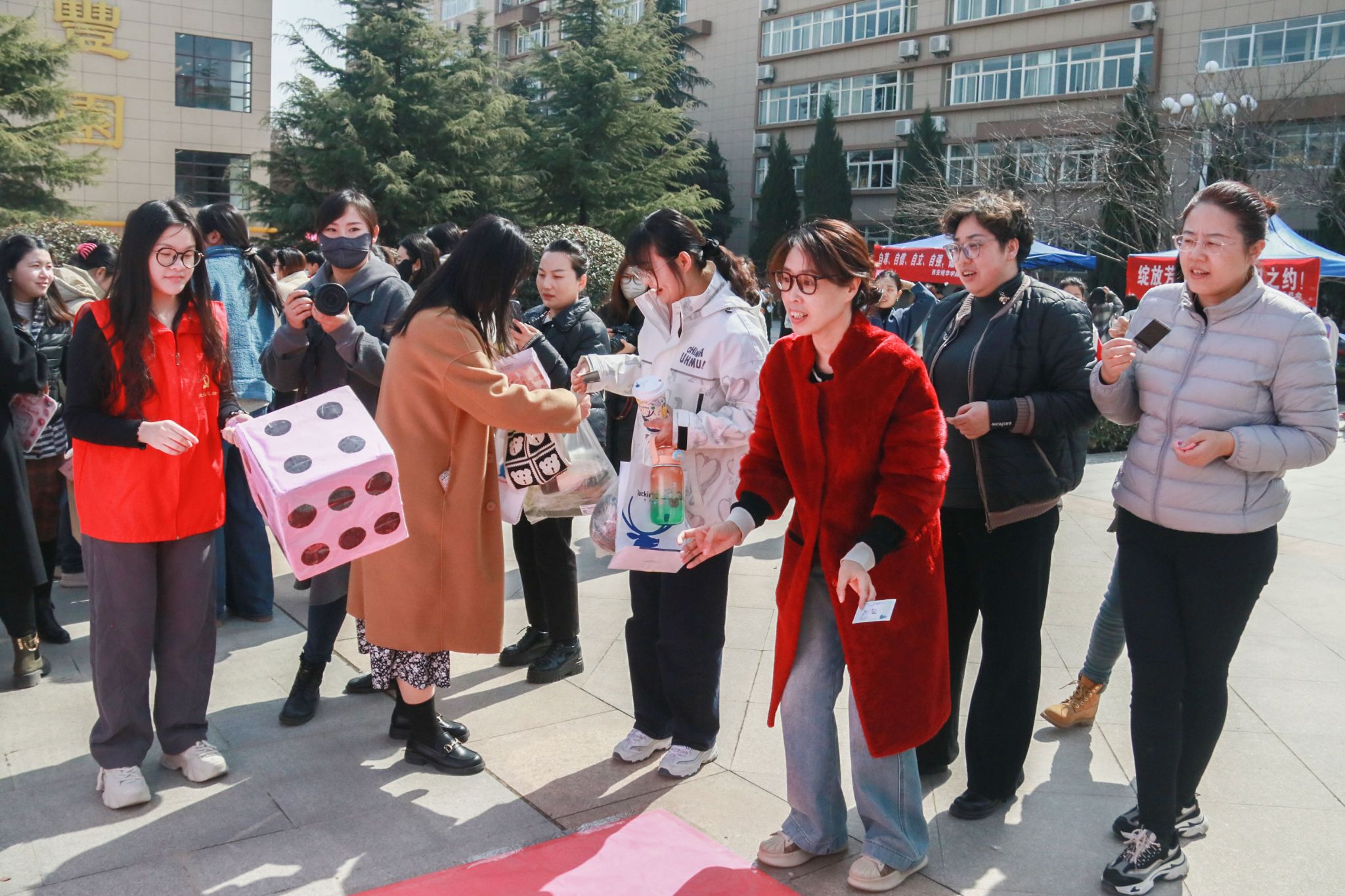 妇女节当天,校工会和校妇联在丰园餐厅西广场举办了“元气女神”游艺会。幸运骰子、投投乐、欢乐套圈等项目,吸引了众多女教职工踊跃参与。大家在游戏中开怀大笑、乐意融融,一颦一笑尽显新时代女性魅力风采。