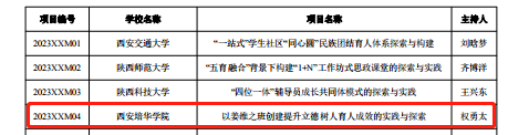 9月5日,中共陕西省委教育工委发布了《关于公布2023年度陕西高校学生工作精品项目和研究课题立项名单的通知》,学校党委学工部副部长权勇太主持的《以姜维之班创建提升立德树人育人成效的实践与探索》获精品项目立项;学生潜能发展中心叶腾老师主持的《“屏媒时代”大学生短视频成瘾现状及教育管理对策分析》获学生工作研究课题立项;人文与国际教育学院党委书记兼副院长南兵主持的《民办高校开展全程化精准化就业指导服务的路径研究》获学生工作研究课题立项。