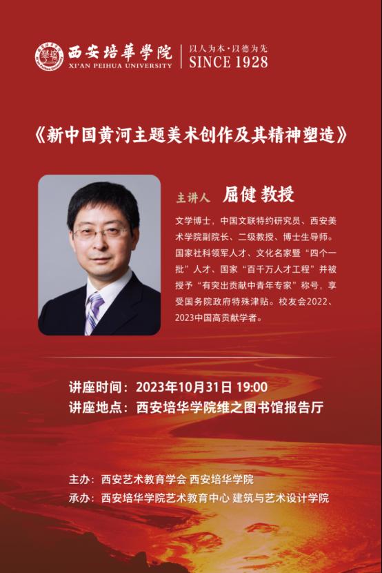 为庆祝培华建校95周年华诞,丰富校园文化生活,提高学生人文素养,10月31日,由西安艺术学会、西安培华学院联合举办,艺术教育中心、建筑与艺术设计学院承办的美育大讲堂活动在图书馆报告厅举行。本次活动邀请中国文联特约研究员、西安美术学院副院长、文学博士、二级教授、博士生导师屈健教授为我校师生带来题为“新中国黄河主题美术创作及其精神塑造”的讲座。艺术教育中心主任刘荣弟,医学院党委书记、副院长王平安,建筑与艺术设计学院副院长王虎,党委书记、副院长王飞,党委副书记南斌红及培华师生500余名学生参加。讲座由西安培华学院副校长姚文静主持。
