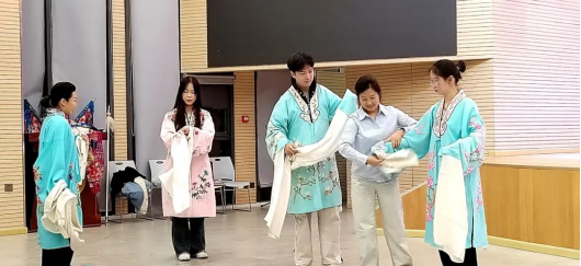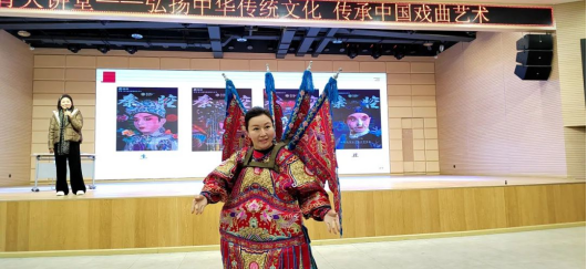 三意社戏曲表演艺术家屈苏宏老师、李晓娟分别扮演了刀马旦和花旦,展示不同任务角色的特点,他们扎实的戏曲功底、娴熟高超的表演技巧,把不同人物内心情绪变化形象塑造的惟妙惟肖。一颦一笑、一招一式都深深吸引了同学们。