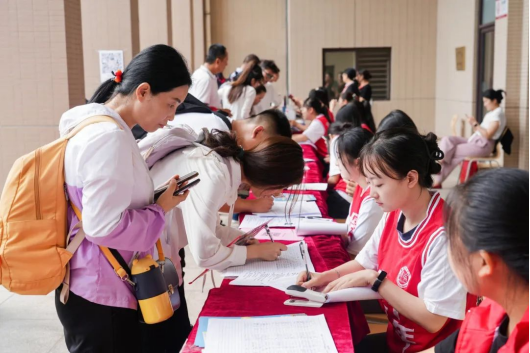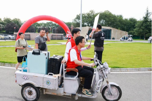 红马甲、小推车、迎新牌...,,,志愿者的身影忙碌穿梭在校园各个地方,全校上下齐动员,热情周到地迎接新同学的到来。