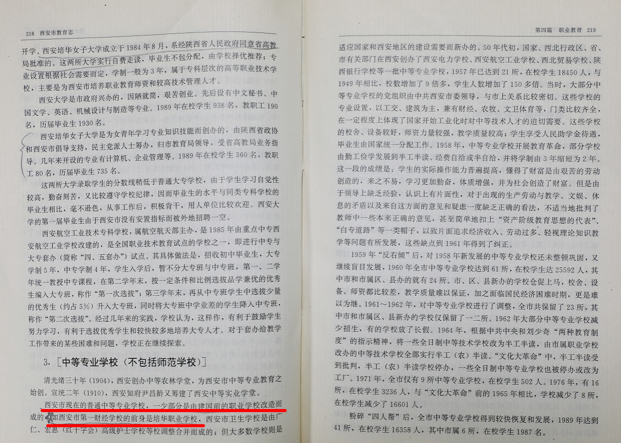 《西安市教育志》第四篇第三节(218页)记载西安市第一财经学校的前身是培华职业学校