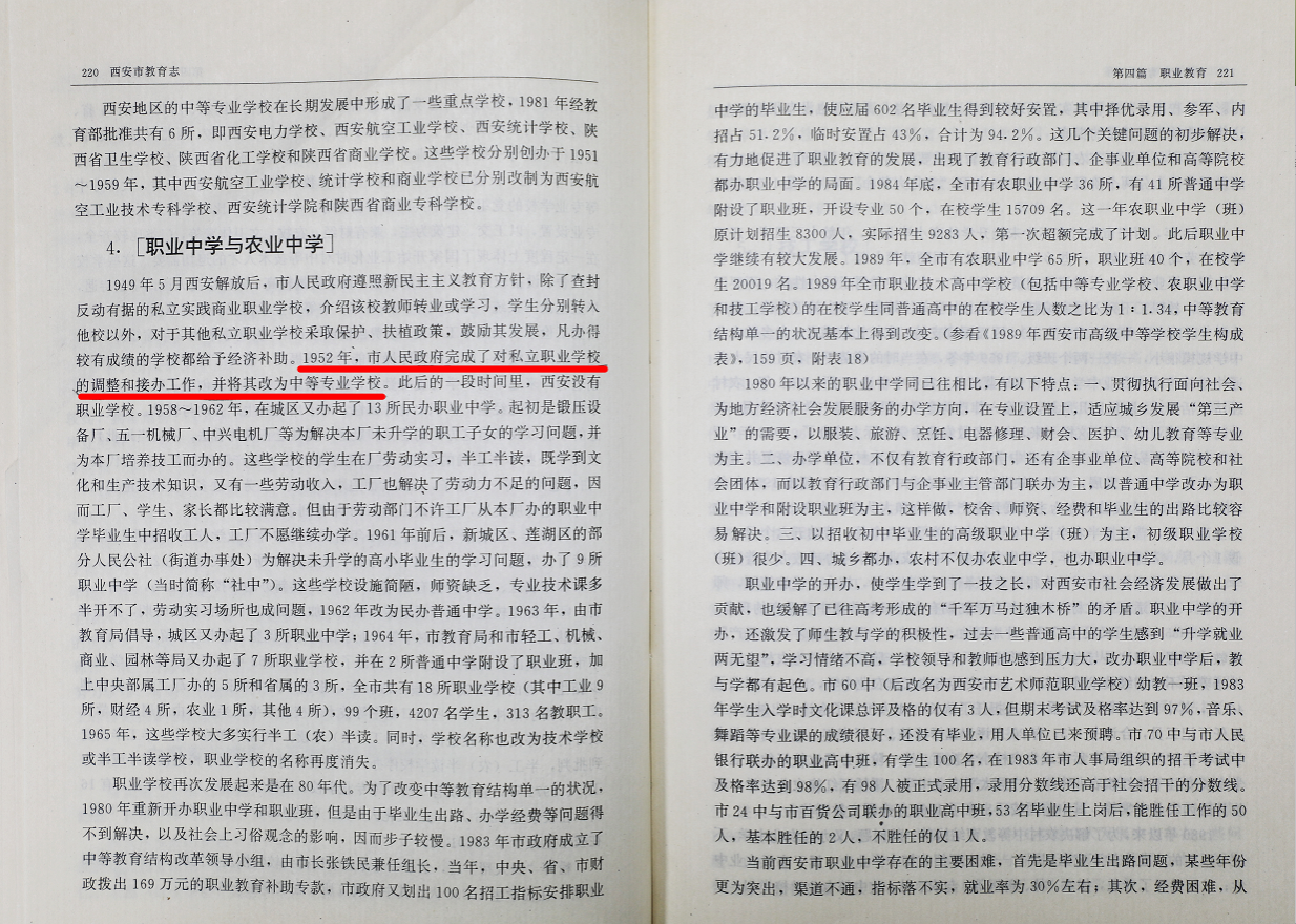 《西安市教育志》(220页)记载1952年市人民政府完成了对私立职业学校的调整与接办工作,培华由私立转为公立