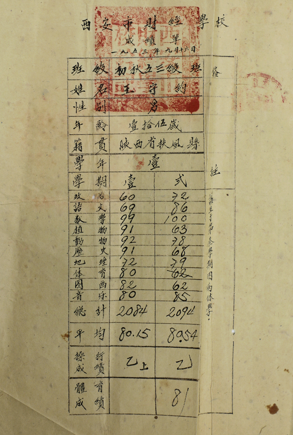 学校收集到一份学生王守约的肄业证明书。根据该证明书(西财肄字第1号)登记的信息显示:学生王守约现年15岁,系陕西省扶风县人,曾在我校前培华职业学校阶段初中秋五三级1年级肄业期满,特此证明。落款的是西安市财经学校校长冯希勃、第一副校长郭育人、第二副校长姜维之。落款时间为1953年9月16日(在该证明书的附件中记载了该生是因为第三学期因病休学,还登记了该生各科成绩)。在这份学生肄业证明书中,清晰地记载西安市财经学校的前身是培华职业学校。并且在培华职校主持工作的副校长姜维之也随着学校更名后成为了西安市财经学校主持工作的副校长(当时校长冯希勃不管日常事务,副校长郭育人赴朝鲜慰问志愿军回国后一直在外做访问报告,学校日常事务由姜维之校长负责)。在姜维之校长的主持下,西安财经学校还修建了一栋三层U型教学楼,该教学楼至今还保存完整,现在为西安市中心医院家属院楼。