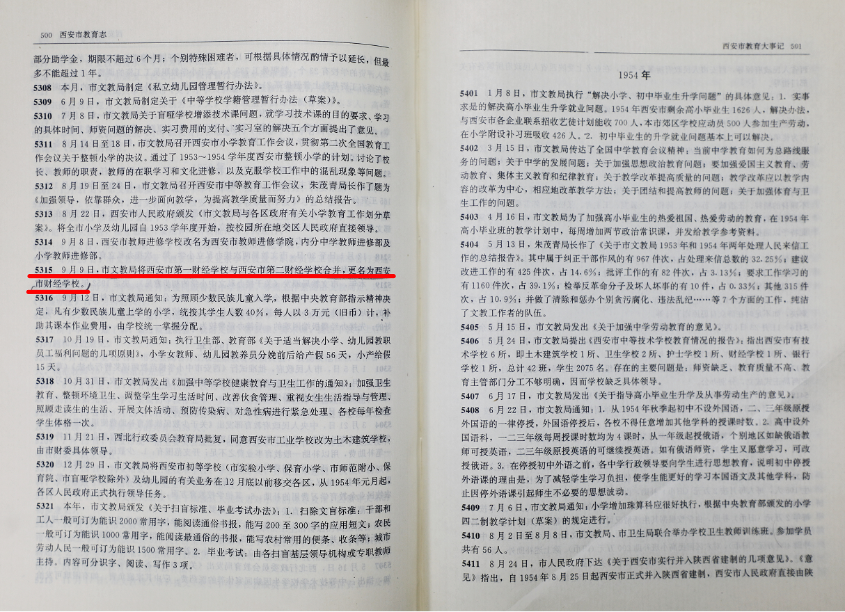 《西安市教育志》第500页记载西安第一财经学校与第二财经学校合并为西安市财经学校