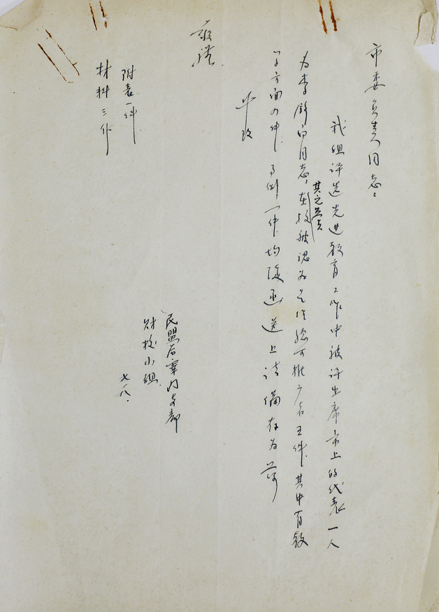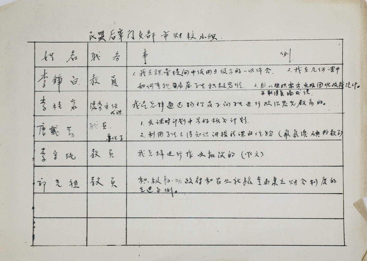 学校还查找到一份民盟后宰门支部西安市财经学校小组写给民盟西安市委的推报先进工作者的材料。材料中写到“市委负责同志:我组评选先进教育工作中,被评出席市上的代表一人,为李铮白同志。其他盟员在校被认为工作尚可推广的有5件,其中有教学方面四件,事例方面一件。均复函送上请备存为荷。”在民盟后宰门支部市财校小组的附件中,列举了教员李铮白的“我在课堂提问中使用五级分的一些体会”“我在几何课中如何重视启发学生积极思考”“服从组织需要克服困难改教统计并取得点滴成绩”,总务主任李桂岩的“我是怎样通过物理教学向学生进行政治思想教育的”(这可能是培华最早开始的课程思政教学了),教员唐戴勤“在课时计划中写好板书计划”“利用学生已得知识讲授新课的经验”,教员李守纯的“我怎样进行作业批改的(作文)”,教员郭光祖的“积极协助政府和农业社检查与建立财会制度的先进事例”等。这份材料中记载的老师同样还是培华职校的教师,他们是因为学校更名而成为财校教师的。