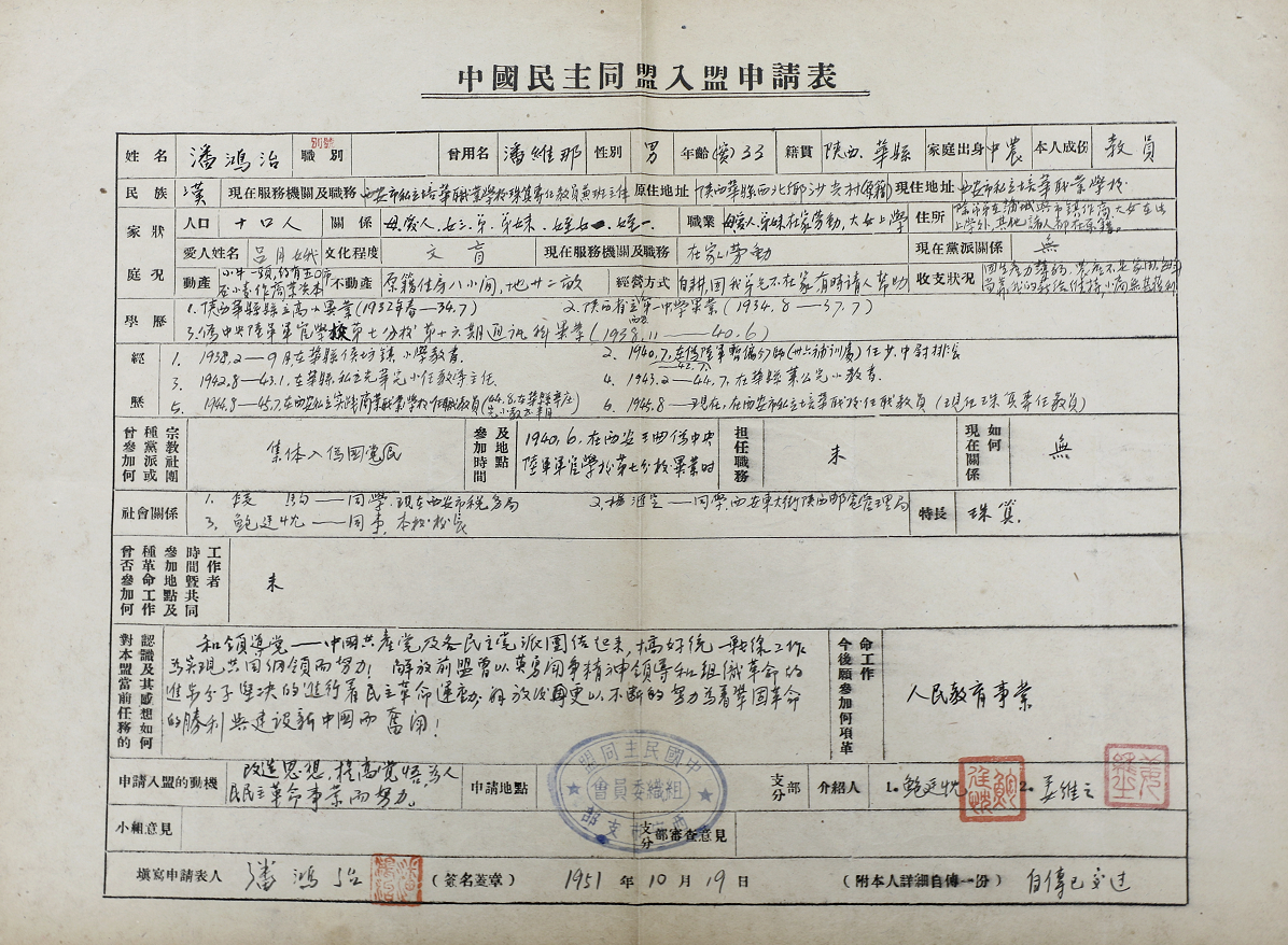 学校收集到了一份西安市财校教师潘鸿治(民盟《后宰门支部改造工作报告》记载)的《中国民主同盟入盟申请表》。在这份申请表的“现任服务机关及职务”一栏中登记为西安市私立培华职业学校珠算专任教员兼班主任,住址为西安市私立培华职业学校。在“入盟介绍人”一栏中填写的是鲍廷忱、姜维之。在“经历”一栏中记载,1945年8月至今,在西安市私立培华职业学校任教(珠算教员)。在“对本盟当前任务的认识及其感想如何”一栏中写到,和领导党——中国共产党及各民主党派团结起来,搞好统一战线工作为实现共同纲领而努力。新中国成立前民盟曾以英勇斗争精神领导和组织革命进步分子坚决地进行着民主革命运动,新中国成立后更以不断的努力为巩固革命的胜利与建设新中国而奋斗。在“申请人入盟动机”一栏中写到,改造思想、提高觉悟,为人民民主革命事业而努力。从潘鸿治这份《入盟申请表》中可以看出,他正是跟随着培华职校更名为西安市财经学校后成为财校老师的,他的任职履历也可以证明西安市财经学校的前身是培华职校。