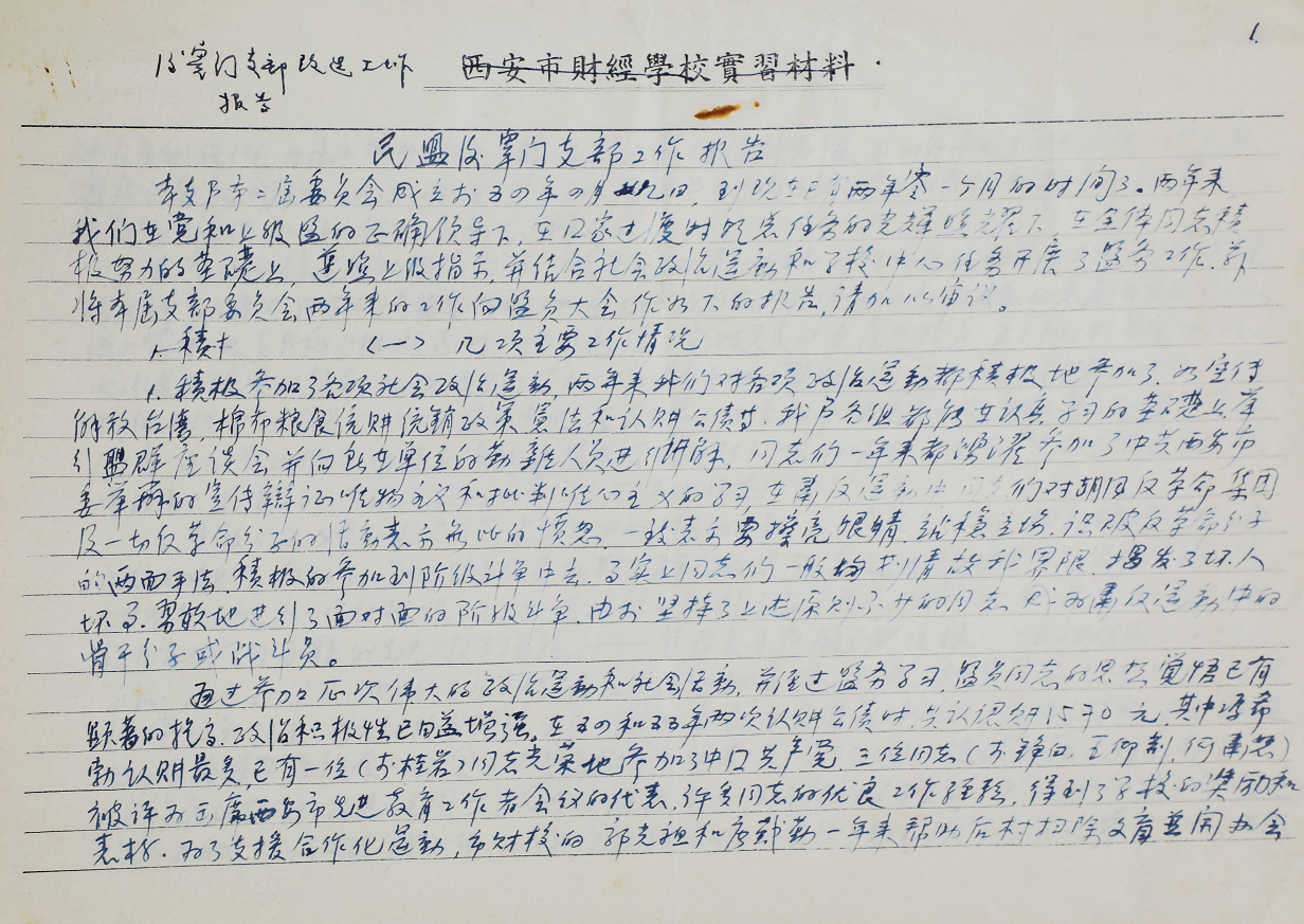在西安市财经学校实习材料上书写的民盟《后宰门支部改造工作报告》