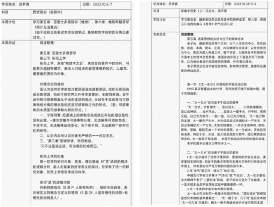 “做笔记不是抄书,而是与作者对话。”在写读书笔记的过程中,吕梦真按照书籍的行文逻辑,用思维导图梳理出每一章的框架,形成清晰的知识脉络。随着理解的深入,她开始做“厚”笔记——在核心考点旁标注原句引用、推理过程和自己的思考,甚至跨文本对比不同哲学家的观点,比如在对比孔子与孟子的“仁”时,她会摘录《论语》和《孟子》中的相关段落,分析其内涵的异同。