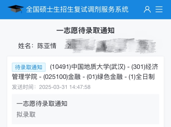 陈亚情的一志愿待录取通知