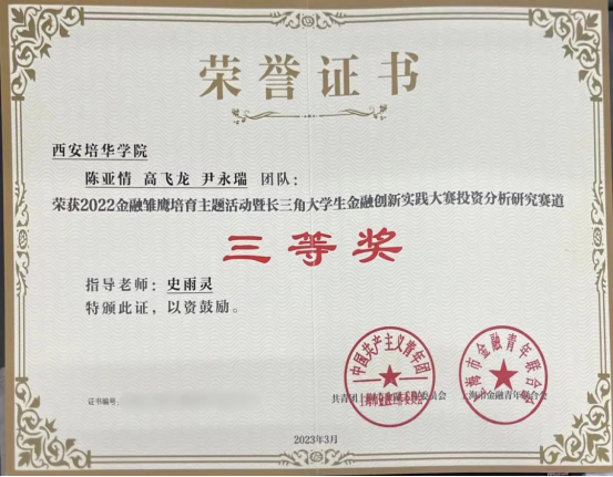 在实习之余,亚情积极参与学校组织的各类科研项目和学科竞赛,跟随导师完成“企业中长期投资战略规划”产学研项目、荣获金融雏鹰杯国家级三等奖、东方财富杯省赛晋级……这些荣誉背后是无数个与队友通宵改方案的夜晚。