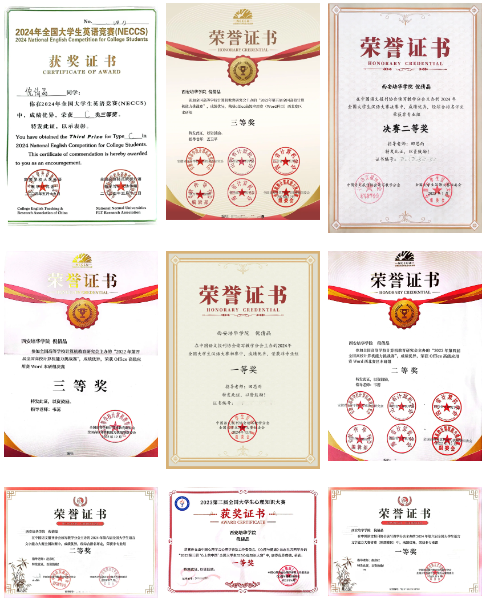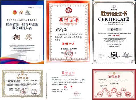 三年来,她累计获得10项国家级荣誉(全国大学生英语竞赛C类三等奖、全国心理知识竞赛一等奖等)、11项省市级荣誉(陕西省语言文字能力大赛三等奖等)、13项校级荣誉,连续三年获“学科竞赛奖学金”。
