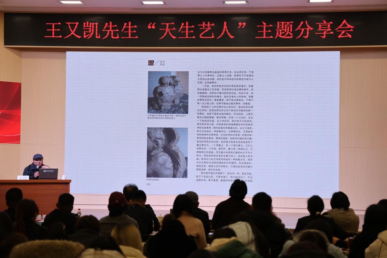 王又凯先生是汪锋同志之子、中央财大精算学院客座教授研究生导师、广州市工艺美术研究所顾问、渭南师范学院美术学院特聘民间美术专家。他以“天生艺人 王又凯捏瓷之路”为核心主题展开分享。他回溯了自己与艺术结缘的历程,在青年时期的在困境中培养了他对艺术的兴趣和一种用泥巴独特看世界的视角。他表示艺术不是与生俱来的技艺,而是对于生活真切的感受。社会实践是艺术创作的源头活水,只有扎根生活、贴近群众,才能创作出有生命力的作品。王又凯老师通过分析自己的创作历程,总结出“无意识创作——有意识创作——自主创作”的规律,鼓励青年学子无需舍近求远,先从生活点滴入手,用心观察,培养艺术感知,逐步进入提升自己的艺术修养和创作能力。此外王又凯老师还从职业发展、瓶颈突破等维度,与学生展开互动交流,针对老师同学们提出的问题,给予专业细致的解答,现场学术氛围浓厚,反向热烈。