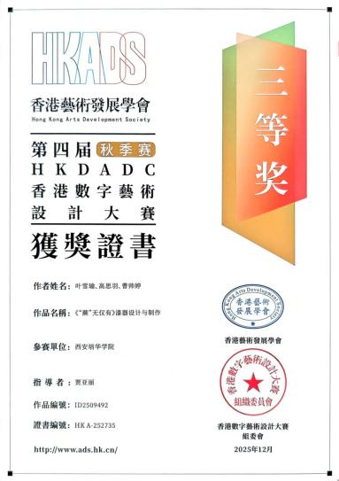 由香港艺术发展基金会指导、香港艺术发展学会主办的第四届HKDADC香港数字艺术设计大赛(秋季赛)评选结果正式揭晓。我院师生凭借卓越的创新思维、精湛的专业技能和深厚的艺术素养,在众多参赛作品中脱颖而出,共斩获一等奖5项、二等奖20项、三等奖37项、优秀奖14项,获奖总数达76项。同时,鉴于我院在赛事组织、作品质量及参与度方面的突出表现,大赛组委会特授予我院“优秀组织单位”荣誉称号