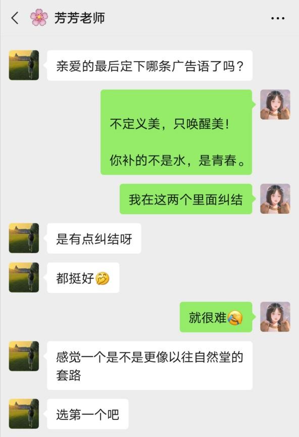 第一个人是我自己。感谢自己当时积极报名,选择了自己最熟悉的广告主——自然堂冰肌水;感谢自己在第一次写出的10条广告语被提出不太容易引起年轻群体关注时,依然没有放弃的念头;感谢自己不断了解自然堂的企业文化,反复揣摩自然堂核心理念“你本来就很美”这句话背后的含义,最终写出了“不定义美,只唤醒美”这8个字。