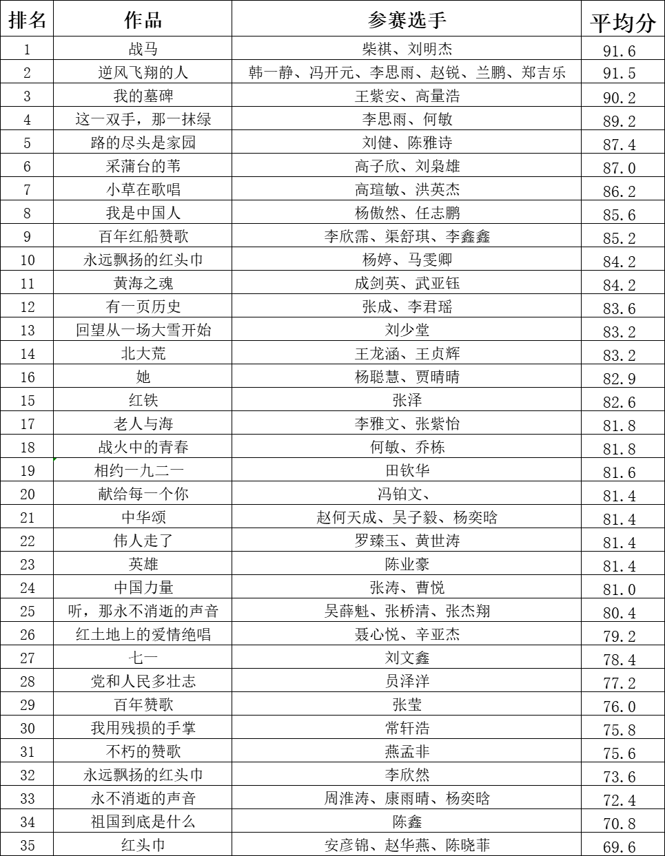 本次分采用百分制,主要从从主题内容、普通话语音、语言表达、台风四个方面进行评分。取各评委算数平均分(取小数点后1位),由高到低依次排名。据悉,本次比赛进入复赛作品共有41组,将会有12组组选手晋级。